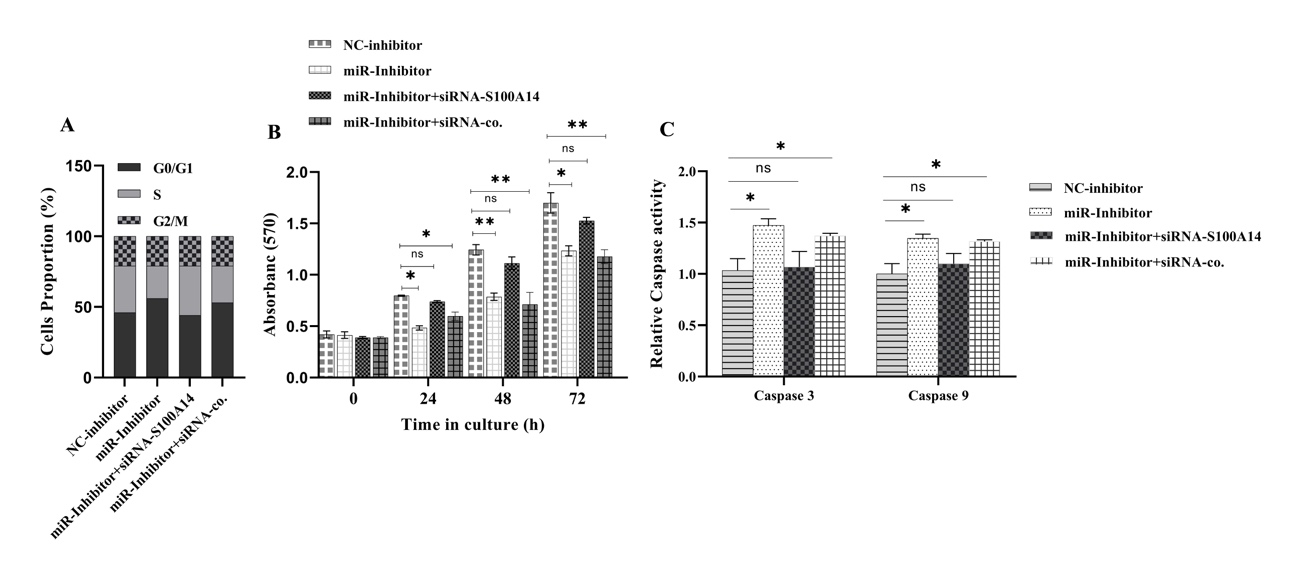 Figure 4 miR-153-5p inhibition reduced cell cycle progression and cell proliferation while inducing apoptosis by targeting S100A14. (A) Cell cycle analysis showing decreased cell cycle progression in miR-153-5p inhibitor and miR-153-5p inhibitor + siRNA-co groups, with no significant changes in NC-inhibitor or miR-153-5p inhibitor + siRNA-S100A14 groups. (B) Cell proliferation assay (MTT) showing a decrease in proliferation at 24h in miR-153-5p inhibitor and miR-153-5p inhibitor + siRNA-co groups, while proliferation significantly decreased at 48h and 72h in miR-153-5p inhibitor + siRNA-co cells. (C) Caspase 3 and caspase 9 activity showing increased expression in miR-153-5p inhibitor and miR-153-5p inhibitor + siRNA-co groups, with no significant changes in NC-inhibitor or miR-153-5p inhibitor + siRNA-S100A14 groups. Data are presented as mean ± SD; *p < 0.05, **p < 0.01 from 3 independent biological replicates (n = 3).
