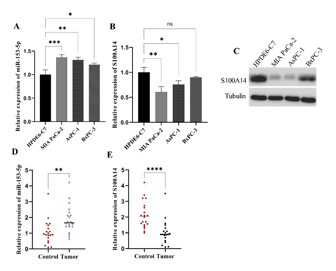 Figure 1 miR-153-5p expression is inversely correlated with S100A14 in pancreatic cancer. (A) qRT-PCR analysis shows increased miR-153-5p expression in pancreatic cancer cell lines (MIA PaCa-2, AsPC-1, BxPC-3) compared to the control HPDE6-C7 cells. (B) S100A14 expression is significantly lower in MIA PaCa-2 and AsPC-1 but shows no significant difference in BxPC-3 compared to HPDE6-C7. (C) Western blot confirms reduced S100A14 protein levels in MIA PaCa-2 and AsPC-1, with similar expression in BxPC-3 and HPDE6-C7. (D) Tumor tissues exhibit significantly higher miR-153-5p expression than control tissues. (E) S100A14 expression is significantly lower in tumor tissues. These results suggest an inverse correlation between miR-153-5p and S100A14 in pancreatic cancer. Statistical significance: *p < 0.05, **p < 0.01, ***p < 0.001, ****p < 0.0001.