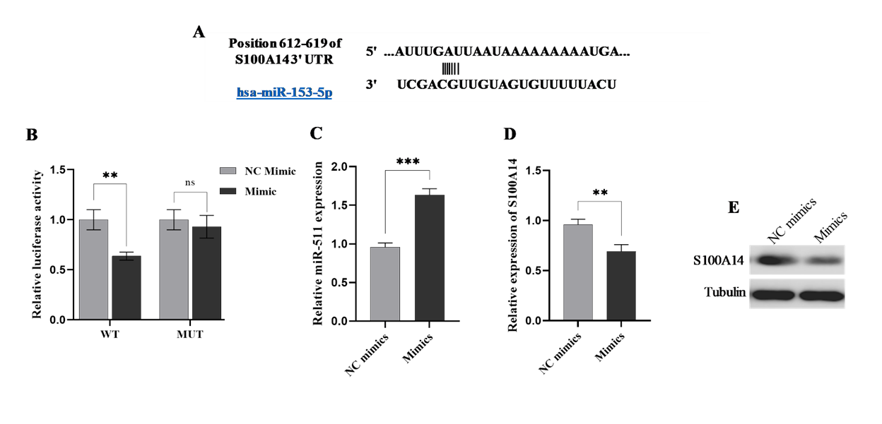 Figure 2 miR-153-5p directly targets S100A14. (A) Predicted binding sites of miR-153-5p in the 3′-UTR of S100A14 cloned into the pmirGLO vector. (B) Luciferase activity assay showing reduced luciferase expression in wild-type but not mutant constructs upon miR-153-5p overexpression. (C) qRT-PCR analysis confirming increased miR-153-5p expression in mimic-transfected cells. (D) qRT-PCR analysis showing a significant decrease in S100A14 mRNA levels in miR-153-5p mimics. (E) Western blot analysis demonstrating reduced S100A14 protein expression in miR-153-5p mimics compared to NC-mimics. Data are presented as mean ± SD; *p < 0.05, **p < 0.01, ***p < 0.001.