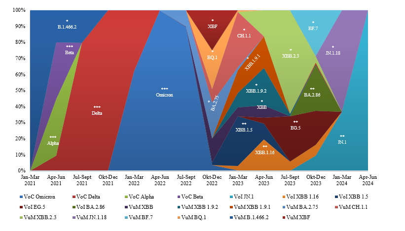 Figure 2 The distribution of SARS-CoV-2 variants in East Java every 3 months, from 2021 to June 2024. Each color represents a specific variant and the period during which it circulated. The asterisk (***) indicates VoC, (**) indicates VoI, and (*) indicates VuM. The lineages listed from the end of 2022 to 2024 are all from the Omicron lineage.