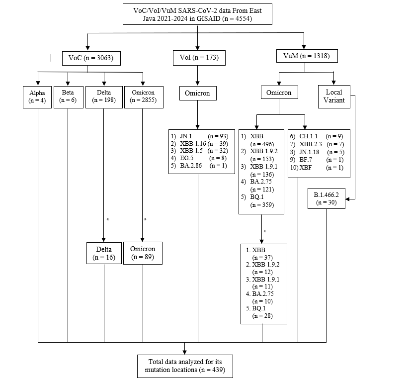 This study used an in-silico approach. The inclusion criteria for this study included whole genomes classified as variants of concern (VoC), variants of interest (VoI), and variants under monitoring (VuM) from East Java during the years 2021 - 2024. Partial or incomplete genomes (<29,000 base pairs) were excluded. The whole genome sequences of viruses isolated from East Java Province; Indonesia were downloaded from the Global Initiative on Sharing All Influenza Data (GISAID) EpiCoV database (https://www. gisaid.org/) [13]. Total of 4.554 sequences were included to identify SARS-CoV-2 variants in East Java. To analyze mutation locations, 439 selected SARS-CoV-2 variant sequences were examined using total sampling and simple random sampling (Figure 1). According to Arikunto (1998), if the number of subjects is less than 100, it is better to include all the research samples.