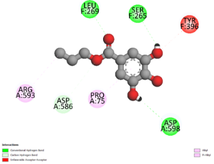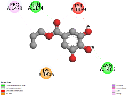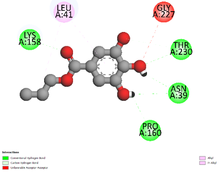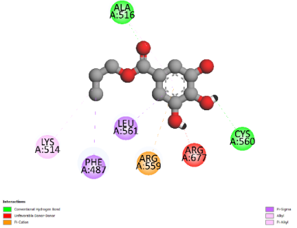 Ca²⁺-ATPase is a membrane-bound enzyme responsible for regulating intracellular concentration of calcium ion (Ca²⁺). It harnesses the energy derived from the hydrolysis of ATP molecules to transport Ca²⁺ ions from the cytoplasm through to the plasma membrane or into organelles, such as sarcoplasmic and endoplasmic reticulum. The activity aids in calcium homeostasis within the cell. Ca²⁺-ATPase regulates the transport of calcium ions to prevent excess calcium accumulation in the cytoplasm [30]. By moving Ca²⁺ away from the cytoplasm or into storage spaces such as the sarcoplasmic or endoplasmic reticulum, it prevents internal imbalance (homeostasis) in the cell. This is particularly necessary in muscle and heart cells, where the enzyme prevents muscle relaxation by pumping calcium out following contraction. Aside from its structural role, calcium takes part in activities like nerve impulse conduction, hormone release, signaling, and gene expression, all of which are Ca²⁺-ATPase-regulated. When Ca²⁺-ATPase is impaired, calcium will pile up inside the cell, causing ailments like heart failure, muscle disease, and nervous diseases. Ca²⁺-ATPase can thus be referred to as an important pharmacological target. Most drugs affecting the heart function by promoting the action of sarcoplasmic/endoplasmic reticulum Ca²⁺-ATPase (SERCA). In our research, while Ca²⁺-ATPase was docked in the presence of the ligand A41, binding energy was -6.6 kcal/mol, and it was observed that there is a good interaction between Ca²⁺-ATPase and A41 molecule. From this binding energy, inhibition constant (Ki value) was observed to be 14.558 µM, which reflects weak inhibitory activity (Table 2(B)). The ligand A41 binds to the following amino acids in Ca²⁺-ATPase: ALA A:516, CYS A:560, LEU A:561, PHE A:487, LYS A:514, ARG A:559, and ARG A:677. These interactions involve traditional hydrogen bonds, pi-sigma bonds, alkyl and pi-alkyl, pi-cation bonds, and donor-donor hydrogen bonds. These non-covalent interactions bind and stabilize the ligand to the enzyme, although the interaction is not strong enough for effective inhibition.