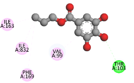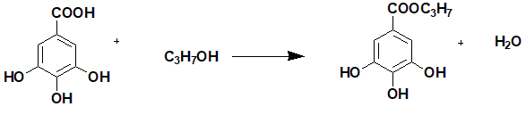 2 g of gallic acid and 50 mL of propyl alcohol and 1 mL of sulfuric acid for the catalyst were placed in a round-bottom flask with a reverse cooler and heated in a nitrogen atmosphere at 98 - 100 C for 8 - 10 h [6,7]. Every half hour, the reaction was checked using thin-layer chromatography. After the reaction, the excess alcohol was distilled under pressure and diluted in 10 mL of ethyl acetate. The organic part was washed 1st with 15 mL of NaCl water and then with 15 mL of a 5 % NaHCO3 solution. The separated precipitate was extracted 3 times with ethyl acetate and evaporated under low pressure (Figure 1). Propyl ester of gallic acid is a white-yellow solid substance. The reaction yield is 75 %. The product was checked using thin-layer chromatography [8]. (1:1 hexane/EtOAc), Rf = 0.87. Melts at 145 - 147 C.