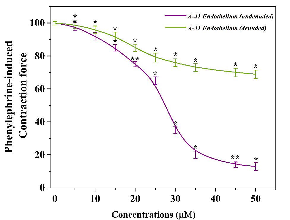 Figure 5 Relaxant effect of A-41 on the contraction induced by Phe 1 μM in the undenuded and denuded of the rat aortic blood vessel endothelial layer. Contraction force elicited by 1 μM Phe was taken as 100 % of control. (in all cases *p < 0.05, **p < 0.01; n = 5).