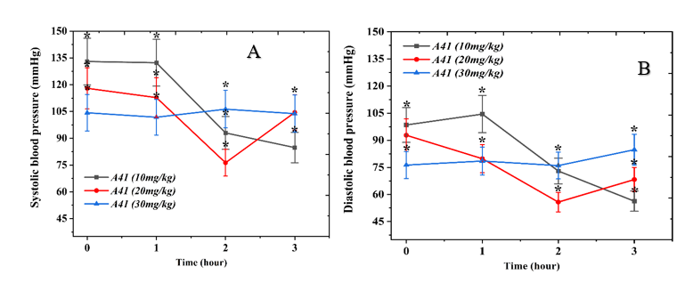 The baseline systolic blood pressure was 104.3 ± 10.2 mmHg, and diastolic blood pressure was 76.3 ± 7.5 mmHg. In the group receiving 30 mg/kg of A41, the blood pressure changes were as follows: