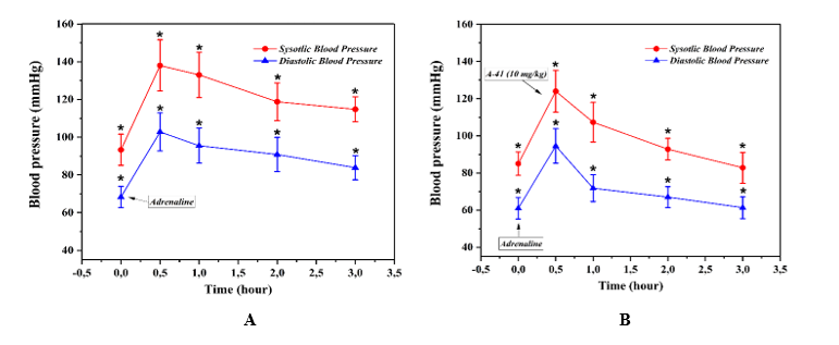 These results show that the A41 compound was effective in lowering blood pressure in adrenaline-induced hypertension. The 10 mg/kg dose of A41 compound demonstrated a pronounced antihypertensive effect. This finding is significant in determining the potential therapeutic possibilities of A41.