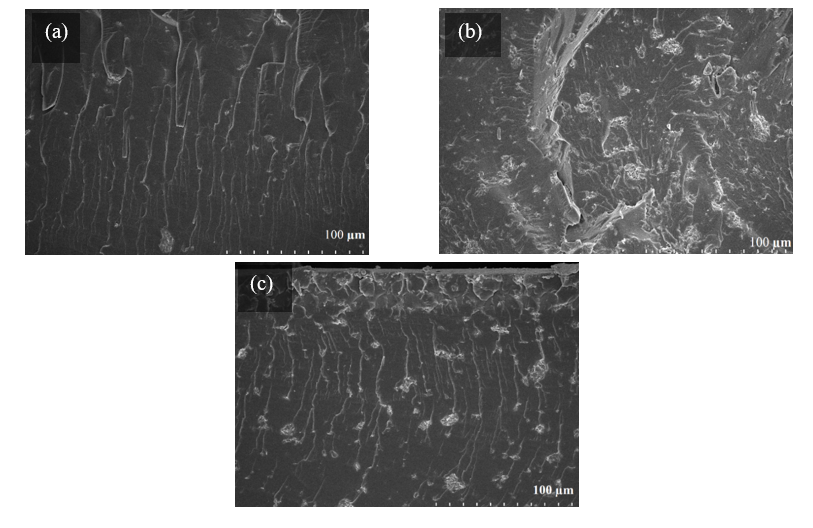 The nanocomposite film surface remains smooth, with a clear polymer fiber structure, suggesting that Nanoclay is well intercalated within the polymer network. As the Nanoclay content increases to 3.0 wt% (Figure 1(b)), more agglomerated regions appear, leading to inhomogeneity in the PVA matrix. These regions may reduce the interaction between the polymer and Nanoclay, affecting the material’s reinforcement efficiency. Notably, at the highest Nanoclay concentration of 5.0 wt% (Figure 1(c)), pronounced agglomeration with large particle clusters is observed. This agglomeration may reduce the mechanical properties of the material by creating weak points in the structure. The possible cause is the increased Van der Waals interactions between Nanoclay layers at higher concentrations, which hinder uniform dispersion in the polymer matrix. To improve Nanoclay dispersion, optimizing the ultrasonic stirring process or using a compatibilizer to enhance interactions between Nanoclay and polymer chains may be necessary.