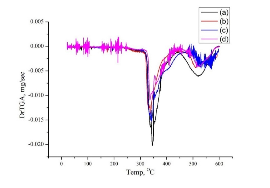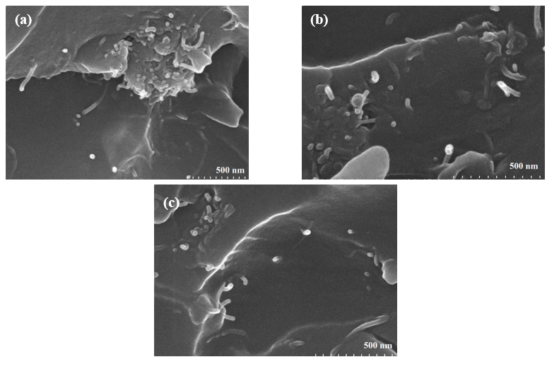 Based on the SEM images in Figure 2, the dispersion of nanoclay in the PVA matrix varies with nanoclay content. At a concentration of 1.0 wt%, the nanoclay platelets are relatively well dispersed in the polymer matrix with minimal aggregation, allowing the material surface to maintain a smooth structure. However, at this level, the reinforcement effect may not be optimal due to insufficient interaction between nanoclay and polymer. When the nanoclay content increases to 3.0 wt%, dispersion remains relatively uniform, with only slight aggregation in certain areas. This appears to be the optimal concentration, as the nanoclay achieves effective interaction with the polymer, significantly improving mechanical and thermal properties without causing structural instability. However, at 5.0 wt% nanoclay, pronounced aggregation occurs, forming large nanoclay clusters that disrupt the polymer network and may degrade some mechanical properties by creating weak points in the structure. This phenomenon may result from increased Van der Waals interactions between nanoclay layers at higher concentrations, reducing uniform dispersion. Therefore, a nanoclay content of 3.0 wt% is considered optimal for enhancing the properties of PVA-nanoclay composite films. To improve dispersion at higher concentrations, the use of compatibilizers or more effective ultrasonic stirring methods may be necessary.