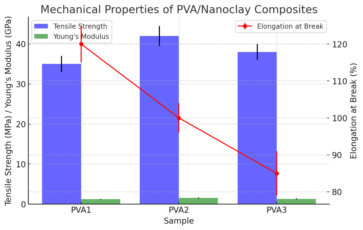 The results of this study demonstrate that incorporating 0.5% MWCNTs and 3% nanoclay into the PVA matrix significantly improves mechanical, thermal, and flame-retardant properties. The composite exhibited a tensile strength of 46.2 MPa, an increase of 40.8% compared to pure PVA (32.8 MPa), while the flexural strength increased by 34.5% from 53.2 MPa to 71.5 MPa. The reinforcement provided by MWCNTs and nanoclay effectively enhanced the stiffness and load-bearing capacity of the material without significantly compromising its flexibility.