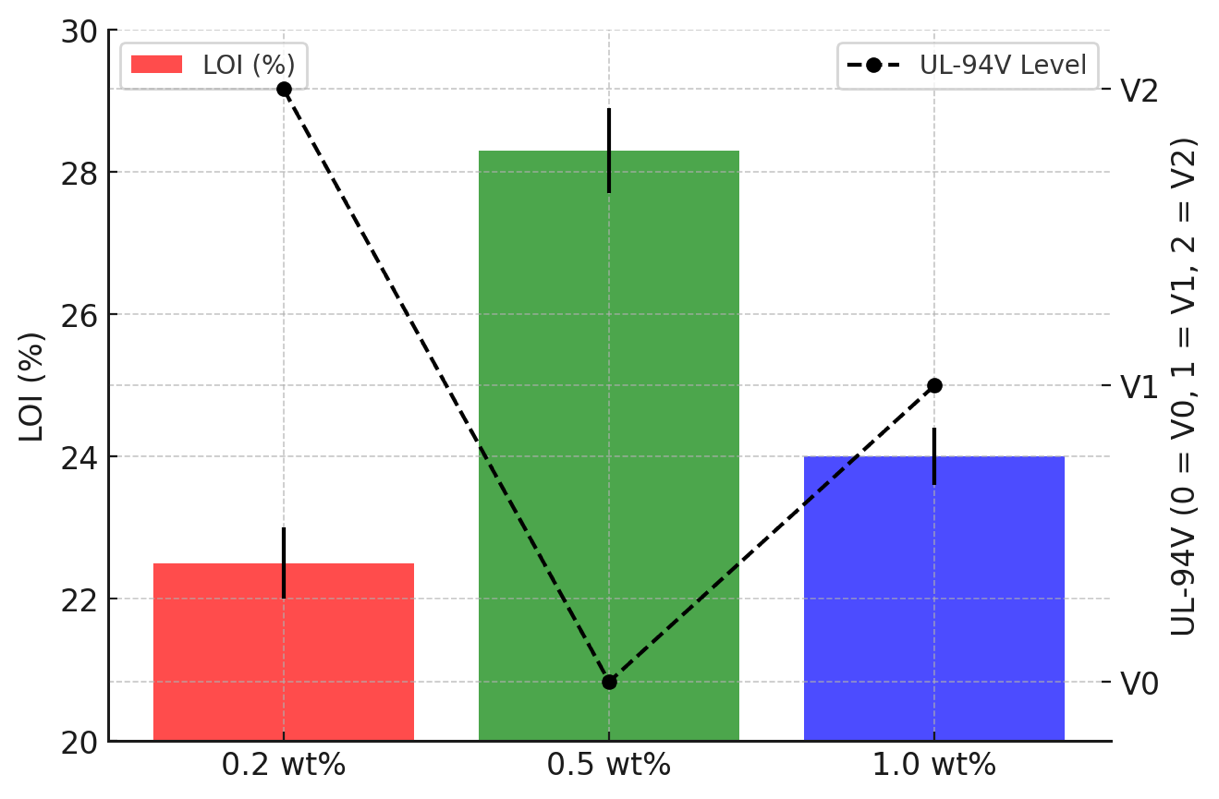 Notably, the composite also exhibited superior flame-retardant performance. The LOI value reached 31.5%, significantly higher than 19.8% for pure PVA, and the material achieved a UL-94 V-0 rating, meaning it self-extinguished within a short duration, thereby improving safety for industrial applications.