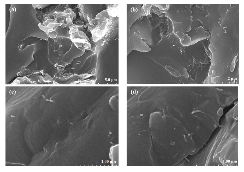 Based on the SEM images in Figure 1, the dispersion of Nanoclay within the PVA matrix varies depending on the filler content. In the PVA/1.0 wt% Nanoclay sample (Figure 1(a)), the Nanoclay platelets are well dispersed without significant agglomeration, indicating good compatibility between Nanoclay and PVA at low concentrations.