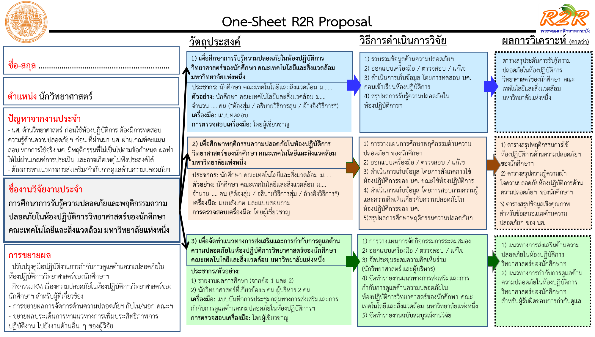 ภาพที่ 9 ตัวอย่าง One–Sheet R2R Proposal เรื่อง การศึกษาการรับรู้ความปลอดภัยและพฤติกรรมความปลอดภัยในห้องปฏิบัติการวิทยาศาสตร์ของนักศึกษา คณะเทคโนโลยีและสิ่งแวดล้อม มหาวิทยาลัยแห่งหนึ่ง