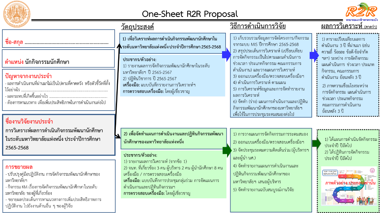 ภาพที่ 5 ตัวอย่าง One–Sheet R2R Proposal เรื่อง การวิเคราะห์ผลการจัดกิจกรรมพัฒนานักศึกษา ในระดับมหาวิทยาลัยแห่งหนึ่ง ประจำปีการศึกษา 2565–2568