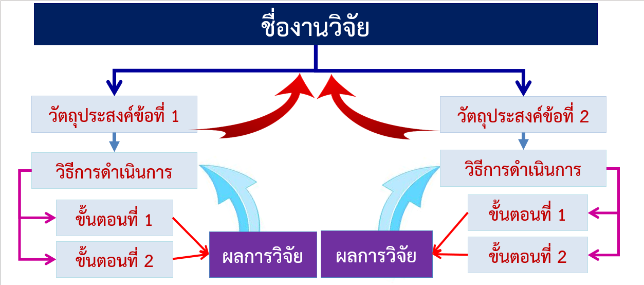 การกำหนดวัตถุประสงค์ของงานวิจัยเป็นขั้นตอนสำคัญที่ต้องสอดคล้องกับทั้งที่มาของปัญหา และชื่อเรื่องที่ได้กำหนดไว้ เนื่องจากวัตถุประสงค์ทำหน้าที่เป็นเข็มทิศ กำหนดทิศทางของการดำเนินการวิจัยให้มีความชัดเจนและตรวจสอบได้ ในกรณีของงาน R2R ซึ่งเน้นการพัฒนางานประจำให้เป็นระบบ วัตถุประสงค์แต่ละข้อจึงควรสะท้อนสิ่งที่ต้องการ ปรับปรุง พัฒนา หรือเพิ่มประสิทธิภาพของกระบวนการทำงานที่มีอยู่จริง ผู้เขียนขอนำเสนอสายสัมพันธ์ของโครงสร้างงานวิจัย (Research Logic Map) ดังภาพที่ 3 ซึ่งจะเห็นได้ว่าวัตถุประสงค์ของงานวิจัยต้องมีความสัมพันธ์อย่างตรงไปตรงมากับวิธีดำเนินการที่ใช้ในแต่ละข้อ กล่าวคือ หากมีวัตถุประสงค์จำนวนกี่ข้อ ก็ต้องมีวิธีดำเนินการรองรับเท่ากับจำนวนนั้น เพื่อให้สามารถทดสอบหรือพิสูจน์ผลตามวัตถุประสงค์ได้อย่างเป็นรูปธรรม วัตถุประสงค์ข้อที่ 1 ต้องมีวิธีดำเนินการข้อที่ 1 และผลการศึกษาที่ตอบวัตถุประสงค์ข้อที่ 1 โดยเฉพาะ ในทำนองเดียวกัน วัตถุประสงค์ข้อที่ 2 ต้องมีวิธีดำเนินการและผลการศึกษาที่สัมพันธ์กับข้อที่ 2 โดยตรง ในทางกลับกัน หากมีวัตถุประสงค์ที่ระบุไว้แต่ไม่มีวิธีดำเนินการรองรับ แสดงว่าส่วนนั้นมิใช่วัตถุประสงค์การวิจัย แต่เป็นประโยชน์ที่คาดว่าจะได้รับ หรือผลลัพธ์หลังการนำงานวิจัยไปใช้ประโยชน์จริง ซึ่งควรแยกออกจากส่วนของวัตถุประสงค์ที่ใช้ดำเนินการตามระเบียบวิธีวิจัย ดังนั้น การกำหนดวัตถุประสงค์ที่ดีจะต้องสะท้อนความเชื่อมโยงครบวงจร ตั้งแต่ ชื่อเรื่อง วัตถุประสงค์ วิธีดำเนินการ และผลการวิจัย โดยที่ผลการศึกษาของแต่ละวัตถุประสงค์ต้องสามารถตอบได้ตรงกับโจทย์ของตน และวัตถุประสงค์ทุกข้อรวมกันต้องสามารถตอบชื่อเรื่องของงานวิจัยได้ทั้งหมดอย่างเป็นระบบและสอดคล้องกัน