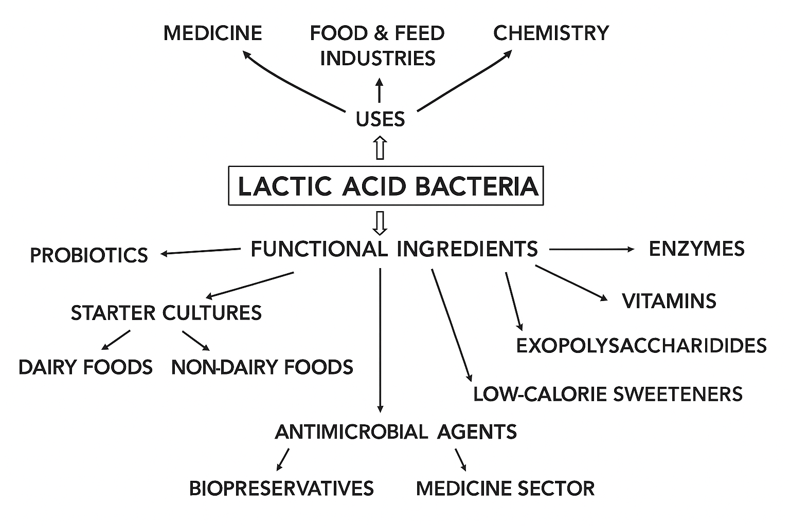 ในด้านอาหาร LAB ถูกนำมาใช้เป็น Starter culture สำหรับการหมักอาหารพื้นบ้านหลายชนิด เช่น ปลาส้ม ปลาร้า และนมหมัก ซึ่งไม่เพียงเพิ่มรสชาติและความปลอดภัยของอาหาร แต่ยังส่งเสริมคุณค่าทางโภชนาการและสุขภาพของผู้บริโภค (Hang et al., 2024) การศึกษาในเชิง Microbiology ของ LAB จากอาหารพื้นบ้านแสดงให้เห็นถึงความหลากหลายของสายพันธุ์ ความสามารถในการต้านเชื้อโรค และการผลิตสาร Functional compounds ที่มีศักยภาพในการใช้เป็นโพรไบโอติก (Probiotic) (Liu et al., 2025)