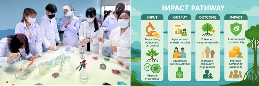 กิจกรรมเหล่านี้ไม่ได้จำกัดอยู่ที่การสอนเพียงอย่างเดียว แต่ยังเปิดโอกาสให้นักศึกษาเรียนรู้การออกแบบการทดลอง การควบคุมตัวแปร และการตีความผลเชิงสถิติ ทำให้นักศึกษาได้สัมผัสกระบวนการ Scientific Method เต็มรูปแบบ เพื่อกระตุ้นให้เกิดผลกระทบที่ยั่งยืน ดังแสดงใน (ภาพที่ 5) เช่น การเก็บข้อมูลและวิเคราะห์ผลอย่างเป็นระบบยังช่วยให้อาจารย์สามารถจัดทำ ฐานข้อมูล LAB สำหรับการวิจัยเชิงประยุกต์ในอนาคต เช่น การสร้าง Starter culture สำหรับอาหารพื้นบ้าน และการพัฒนาผลิตภัณฑ์เครื่องสำอางที่มีคุณสมบัติ Antioxidant