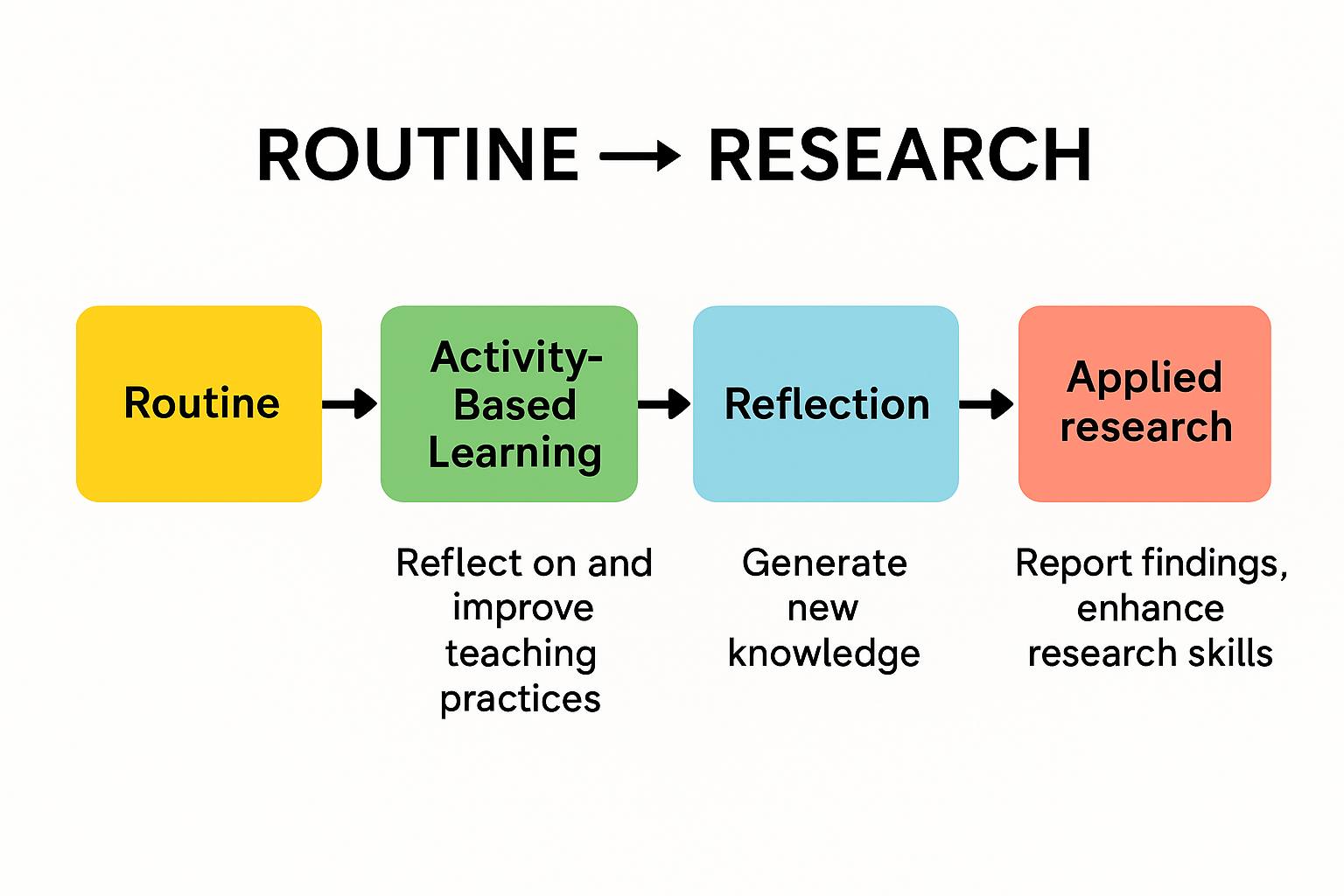 การประยุกต์ใช้แนวคิด Routine-to-Research นี้ยังสามารถสนับสนุน การเรียนรู้แบบ Active Learning และ Problem-Based Learning (PBL) ซึ่งทำให้นักศึกษามีส่วนร่วมอย่างเต็มที่ในการเรียนรู้และการแก้ปัญหาที่เกิดขึ้นจริง การสร้างบันทึกกิจกรรม การสังเกตพฤติกรรมและผลการทดลองของนักศึกษา ช่วยให้ผู้สอนสามารถปรับปรุงวิธีการสอนและระบุโอกาสในการต่อยอดเป็นงานวิจัยเชิงประยุกต์ได้อย่างเป็นระบบ (Olimpo & Esparza, 2020)