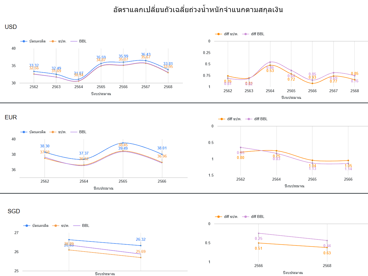 1. ส่วนต่างอัตราแลกเปลี่ยน (Spread Gap) จากการเปรียบเทียบข้อมูลอนุกรมเวลา พบปรากฏการณ์ที่ “อัตราแลกเปลี่ยนที่เรียกเก็บจริงจากบัตรเครดิต” (Credit Card Rate) มีค่าสูงกว่า “อัตราอ้างอิงของธนาคารกรุงเทพ” (BBL Rate) และ “อัตราอ้างอิงของธนาคารแห่งประเทศไทย” (BOT Rate) ในทุกปีงบประมาณ โดยส่วนต่างดังกล่าวมีความผันผวนตามสภาวะเศรษฐกิจ
